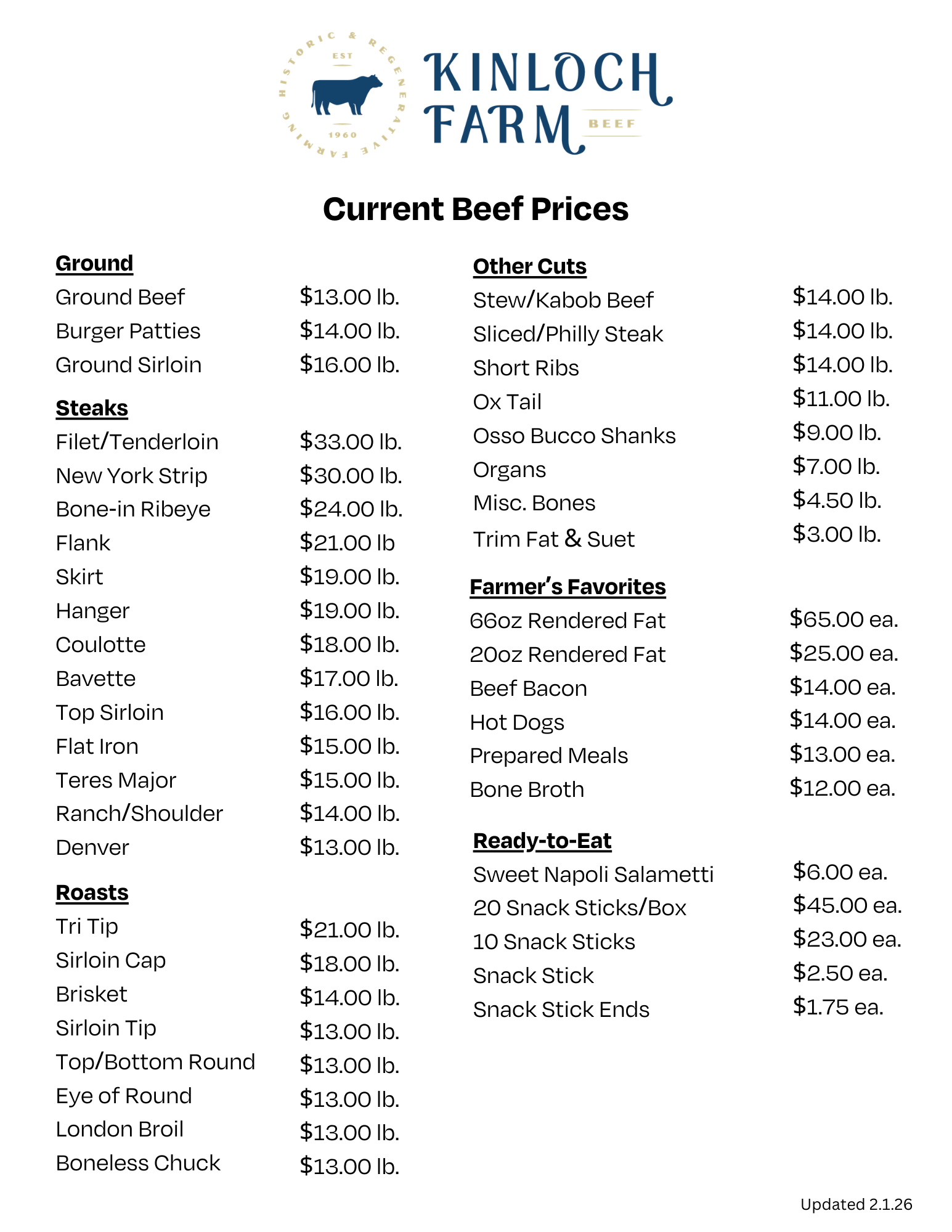 Our selection of individually pre-portioned cuts is available for in-store pickup at our Farm Store in The Plains. A full list of available cuts is provided below, with select items also available for online ordering.